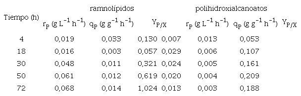 El cálculo de los parámetros cinéticos y estequiométricos determinados a diferentes intervalos de tiempo (tabla 1) revelaron que el mayor rendimiento de ramnolípidos se logra al finalizar el cultivo (YP/X = 1,024), no ocurriendo lo mismo para la producción de polihidroxialcanoatos, cuyo rendimiento máximo (YP/X = 0,209) se alcanzó a las 50 h de cultivo.