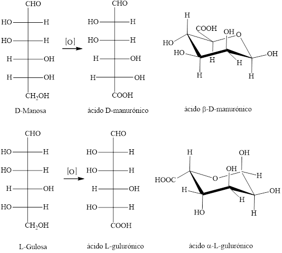 El alginato es un polisacárido lineal constituido por unidades de los ácidos urónicos (-D-Manurónico (M) y (-L-gulurónico (G), provenientes de la oxidación selectiva del grupo -CH2-OH del extremo terminal de los epímeros D-Manosa y L-Gulosa, respectivamente (figura 1), las que se unen formando este heteropolímero a través de enlaces glicosídicos 1,4, con configuración ( o ( (figura 2). En las algas pardas, el alginato se encuentra en forma de sales monovalentes (sodio y potasio) y divalentes (calcio, magnesio, estroncio y bario),17 es por ello que los monómeros constituyentes de los bloques M, G y MG/GM representados en la figura 2, se encuentran en forma de sales (carboxilatos).