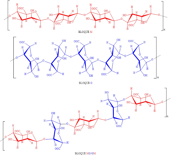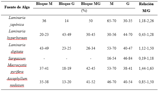 En la figura 2 se distingue para el bloque M una estructura tipo cinta plana, para el bloque G una estructura abultada o capsular, y en el bloque MG/GM una estructura tipo escalera.17 La distribución secuencial y cantidad relativa de los monómeros M y G dependen de la fuente de alginato, especie de alga, partes del alga, condiciones de crecimiento, variaciones geográficas y estación del año.4,20,21 Los frutos de Ascophyllum nodosum contienen altas cantidades de ácido manurónico cuando se compara con el contenido de tejidos viejos, los que son abundantes en ácido gulurónico.22 De manera similar, las hojas de Laminaria hyperborean contienen una gran cantidad de ácido manurónico, a diferencia de la corteza que es rica en gulurónico.23) La relación M:G es generalmente 1:1, aunque la relación M:G en Ascophyllum nodosum puede aparecer en proporción 2:1.21 Para algunas macroalgas se han reportado los contenidos de bloques y de unidades monoméricas, los que se exhiben en la tabla 2.7,24,25