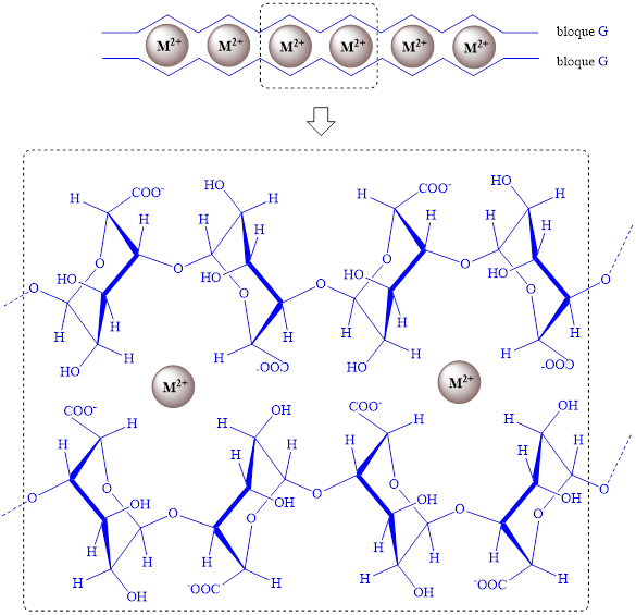 En la mayoría de las macroalgas se observa la superioridad de unidades de ácido manurónico, siendo predominantes en ácido gulurónico las especies en orden creciente Ascophyllum nodosum, Laminaria hyperborean y Sargassum (tabla 2). El contenido de unidades G se relaciona con una de las propiedades del alginato más destacada y explotada en la industria: su capacidad de formar hidrogeles mediante entrecruzamiento iónico con cationes divalentes.17,26 Los cationes divalentes se enlazan a cadenas poliméricas adyacentes de bloques G, formando una red de gel tridimensional, según el modelo denominado “caja de huevos” (figura 3).26,27 Aunque el contenido de unidades G se considera como el factor principal que determina la elasticidad del gel, porosidad y estabilidad, 26 se ha señalado que las unidades de M, formando parte del bloque MG/GM, pueden contribuir a la formación de hidrogeles. De esta forma, se establecen tres posibles uniones de cadenas poliméricas adyacentes: bloque G-bloque G, bloque MG- bloque MG y bloque G-bloque MG.26
