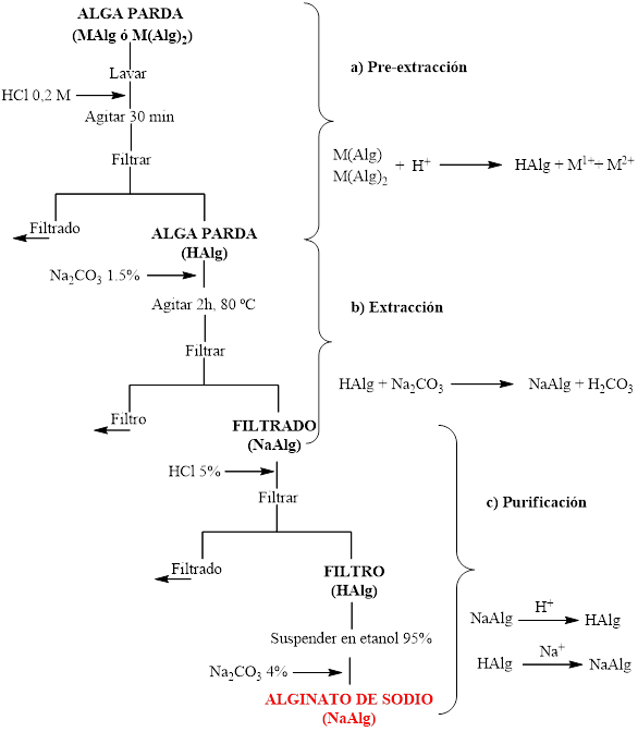 En 2019 salió a la luz una revisión detallada de los métodos convencionales y novedosos de obtención de alginato a partir de algas pardas.29 Los primeros se basan, principalmente, en tratamiento térmico con Na2CO3, mientras que los nuevos se corresponden con protocolos de extracción asistida por ultrasonido o por microondas. En los procedimientos de extracción de alginato, independientemente que sea convencional o novedoso, pueden distinguirse tres etapas fundamentales: (a) pre-tratamiento del alga, (b) extracción y (c) purificación.17