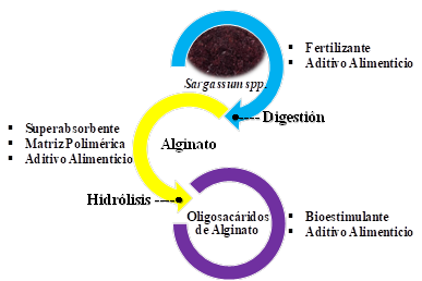 La especie de alga parda Sargassum, es utilizada como fuente comercial de alginato, ficocoloide ampliamente investigado por sus diversas aplicaciones en las industrias farmacéutica, alimenticia, química, textil, cosmética, biotecnológica, bioimpresión 3D y agrícola,6,7 debido a sus propiedades espesantes, gelificantes, estabilizantes, así como su baja toxicidad, biocompatibilidad, biodegradabilidad y relativo bajo costo.7