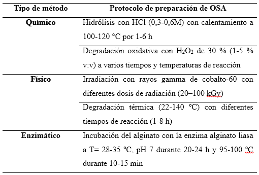 Los OSA se consideran como oligómeros de bajo peso molecular, que contienen de 2 a 25 unidades monoméricas de G y/o M,24 formadas, generalmente, mediante escisión de enlaces glicosídicos, aunque los OSA pueden obtenerse también a través de síntesis orgánica o vía biosintética.24 La escisión de los enlaces glicosídicos para la obtención de OSA puede llevarse a cabo mediante métodos químicos, físicos o enzimáticos.