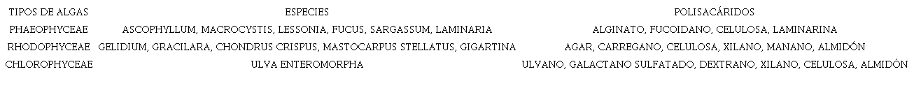 Las macroalgas, según señalan García & Peteiro 12 presentan grandes diferencias en su morfología, ciclo biológico, reproducción, hábitat y ecología, aspectos que se considera para establecer modelos de gestión de este recurso natural. En la tabla 1 se presentan las especies representativas de estos tipos de algas, así como los polisacáridos estructurales y de reserva que contienen.
