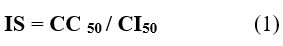 El índice de selectividad (IS) para examinar la relación entre la citotoxicidad y una actividad elegida, se definió como la relación entre el valor CC50 de citotoxicidad y el valor CI50 de actividad antimicrobiana 18, según la ecuación (1).