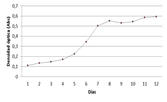 El cultivo se llevó a cabo en el Laboratorio de Anticuerpos y Biomodelos Experimentales (LABEX), el comportamiento de P. cruentum en el medio de cultivo Walne, fue observado durante doce días con mediciones diarias de absorbancia a 545 nm. Los datos obtenidos durante este tiempo fueron promediados y graficados para evaluar la curva de crecimiento de la microalga en estudio (figura 1).