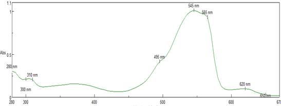 La microalga Porphyridium cruentum ha demostrado ser eficiente en la producción de ficoeritrina, ya que se ha encontrado que esta especie produce grandes cantidades de esta proteína, por lo que llevar a cabo un barrido espectrofotométrico nos puede indicar la presencia de este compuesto químico en la microalga, además de otros métodos que nos pueden indicar con exactitud la composición química de Porphyridium cruentum. El barrido de las muestras de biomasa lisadas se obtuvo mediante la relación de absorbancias a estas longitudes de onda, (545 nm/280 nm); se obtuvo una pureza promedio de 4,7 lo cual está en correspondencia con lo reportado en la literatura.20 En la figura 2 se muestra la curva de barrido obtenida.