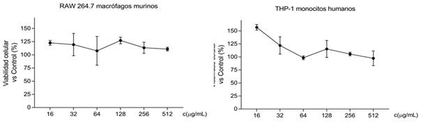 Se evaluó el efecto citotóxico por el método de reducción de rezasurina sobre la viabilidad celular de las líneas RAW 264.7 (macrófagos murinos, adherentes) y TPH-1 (pre-monocitos de leucemia humana en suspensión). Ambas líneas celulares se adquirieron de ATCC (American Type Culture Collection). Se usó el fármaco de referencia, tamoxifeno como control estándar. Se utilizaron condiciones de cultivo específicas para garantizar el crecimiento satisfactorio de las líneas celulares, de acuerdo con los procedimientos estándar.