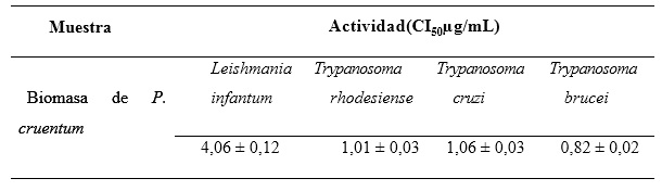 La biomasa de P. cruentum muestra valores de actividad, sobre todo frente a parásitos del género Trypanosoma: T. brucei, T. rhodesiensis y T. cruzi. En el caso del estudio frente a L. infantum, los resultados revelaron un marcado efecto inhibitorio, pero por debajo de lo exhibido contra el género Trypanosoma, lo que denota una mayor sensibilidad por estos parásitos frente a componentes presentes en la biomasa de la microalga.23