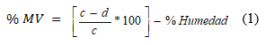 En un crisol tarado, se pesa 0,5 g de la muestra seca, se tapa y se lleva a una mufla a 950°C durante 7 min; luego se deja enfriar en desecadora, y se pesa hasta masa constante. Para el cálculo se utiliza la expresión (1).