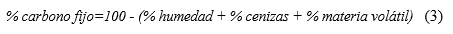 Los valores de carbón fijo se obtienen a partir de los resultados de la determinación de humedad, cenizas y materia volátil.15) Para el cálculo se utiliza la expresión (3).