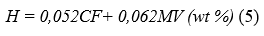 Los intervalos en los que deben oscilar los valores experimentales de materia volátil (MV) y carbón fijo (CF), utilizados para el cálculo y los contenidos de carbono (C), hidrógeno (H) y oxígeno (O) en la biomasa, se muestran a continuación: