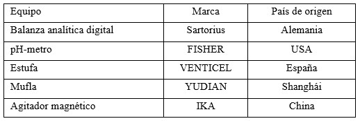 Los análisis se realizaron en el Departamento de Química, de la Universidad de Oriente, y el laboratorio de análisis químico del central azucarero “Paquito Rosales”. El equipamiento utilizado se presenta en la tabla 1.