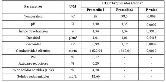 En cuanto al análisis estadístico (ver tabla 2), cuando se comparan los resultados obtenidos en esta investigación (Promedio 1), con los reportados por Ibarra (Promedio 2), se puede apreciar que solo el índice de refracción y la densidad son estadísticamente iguales, con un grado de significación del 95 %. Esto pude estar influenciado por la utilización de sustratos con distinta composición, pues las mieles finales que se emplean en la entidad, no tienen la misma procedencia, ni la misma calidad, entre otros factores.