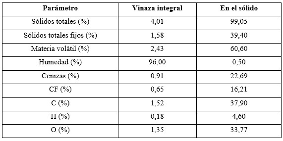 La vinaza de destilería tiene un alto potencial contaminante, debido a la gran cantidad de sólidos disueltos, bajo pH y alta temperatura, por lo que debe aprovecharse para obtener materiales carbonosos, o en otros usos que reduzcan ese impacto. Su alto contenido de sales minerales se verificó por la elevada conductividad eléctrica y en el contenido de cenizas, tanto en la vinaza, como en su sólido.