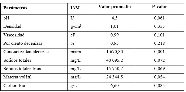 En la tabla 2 se presentan los resultados obtenidos durante la caracterización de la vinaza de destilería objeto de estudio (Promedio 1).