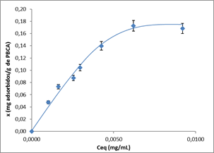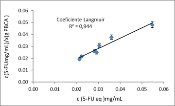 Como se aprecia en la figura 2, los datos muestran un buen ajuste al modelo empleado con valores de coeficiente de determinación (R2) de 0,94. Este resultado indica, que el 5-FU en las condiciones trabajadas se adsorbe en forma de monocapa sobre las partículas de PBCA.