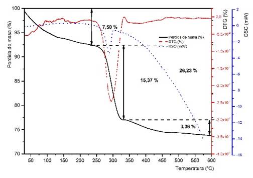 Para la muestra B obtenida con licor industrial este resultado se confirma mediante el análisis DSC que muestra un único pico endotérmico a 288 °C. Desde 330 ºC hasta 600 ºC se produce otra pérdida gradual de masa que corresponde a 3,36 %, sin que se produzcan cambios significativos en la curva de DSC. La pérdida de masa involucrada a temperaturas superiores a 330 ºC puede estar asociada a la presencia de impurezas como sulfatos o carbonatos. En total, la descomposición térmica del hidróxido hasta los 600 ºC experimenta una pérdida de masa de 21,24 % para la muestra de referencia y 26,23 % para el hidróxido obtenido con licor industrial.