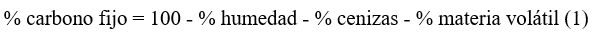 Este valor se obtuvo por diferencias a partir de los contenidos de humedad, cenizas y material volátil. Para el cálculo se utilizó la siguiente expresión: