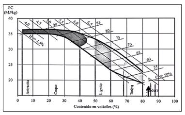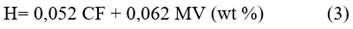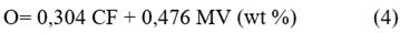Los autores proponen los intervalos en los que deben oscilar los valores experimentales de materia volátil (MV) y carbón fijo (CF), utilizados para el cálculo y los contenidos de carbono (C), hidrógeno (H) y oxígeno (O) objeto de análisis, los que se especifican a continuación: