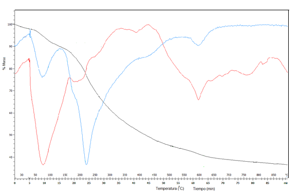 El registro térmico se obtuvo en equipo de análisis térmico simultáneo de NETZSCH STA 449 F3 Jupiter®. Se utilizó una velocidad de calentamiento de 10 °C/min, con flujo de nitrógeno de 60 mL/min, para garantizar la atmósfera inerte y una muestra de 0,5 mg. El procesamiento de los datos de termogravimetría (ATG), termogravimetría derivada (TGD) y calorimetría diferencial de barrido (CDB) se realiza con el software Origin 8.1. Se estudiaron por estas técnicas tanto el bagazo natural, como el modificado con sales de cloruro de hierro (III).