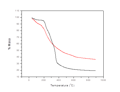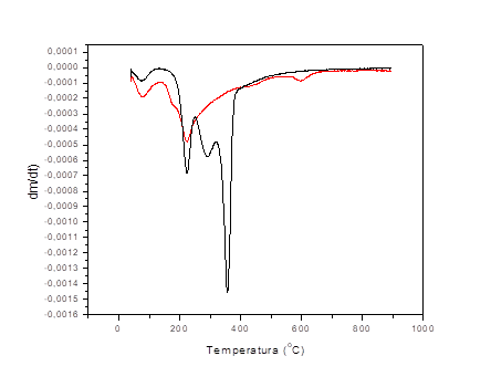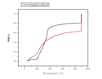 Al comparar las curvas de Termogravimetría derivada (TGD) del bagazo sin modificar (curva negra), con el bagazo modificado con cloruro de hierro (III) (curva roja), se identifica que el perfil térmico (forma de las curvas) es más afectado, que el intervalo de temperatura en el cual tiene lugar la reacción de pirólisis.