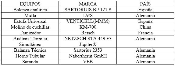 Se presentan los materiales y equipos utilizados, así como las operaciones empleadas para la caracterización de la biomasa y su pirólisis. Los equipos utilizados se encuentran disponibles en Laboratorios de la Facultad de Ciencias Naturales y Exactas y el laboratorio de Biomasa, del Centro de Estudio de Energía y Refrigeración de la Universidad de Oriente (tabla 1). Los reactivos utilizados todos son puros para análisis.