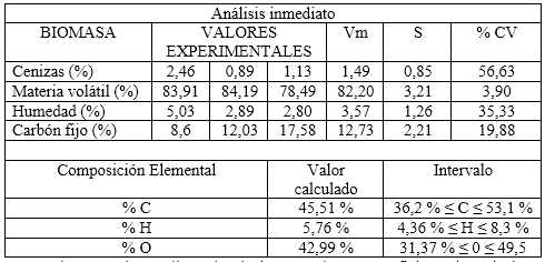Se calculó, de manera preliminar, la composición elemental de la biomasa, partiendo de diferentes correlaciones /2, 3 y 4/ propuestas por Parikh y col., empleando los datos obtenidos experimentalmente en el análisis inmediato.11 El error absoluto promedio del cálculo es de 3,21 %; 4,79 %; 3,4 % con respecto a los valores medidos de C, H y O, respectivamente: