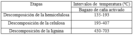 Disponer de los tres perfiles térmicos (ATG, TGD y CDB) de la degradación pirolítica del bagazo de caña modificado con cloruro de hierro (III) de forma simultánea, permitió un estudio integral del proceso y una mejor precisión de las etapas por las que transcurre el mismo. Todo lo anterior permitió proponer en la tabla 3 los intervalos de temperatura en los que predomina la termodescomposición de los constituyentes principales de la biomasa, y que son la base del estudio cinético.