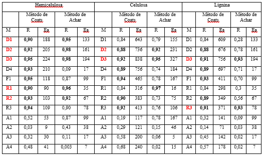 Finalmente se presentan los resultados relacionados con la cinética de degradación de la lignina (tabla 4). Los modelos que determinan la velocidad de la reacción son D3, R3. Los valores de energía de activación se encuentran en el intervalo entre 78-756 kJ·mol-1.
