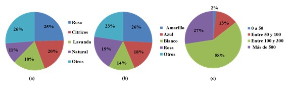 La encuesta del estudio de mercado (tabla 2) arrojó los siguientes resultados: el 100 % de la población utiliza champú para lavar su cabello; el 69 % mencionó que asea diariamente su cabello; un 25 % prefiere el aroma a rosas mientras que otro 20 % prefiere el aroma cítrico. El 26 % de la población encuestada prefiere que el champú sea de color amarillo y el 23 % rosa. El 58 % gasta entre 100 y 300 mL de champú en un mes, en tanto el 47 % solo lo utiliza como un producto de limpieza para su cabello. Es importante mencionar que el 22 % lo usa para disminuir la caída del cabello y que el 44 % de la población presenta dicho problema.