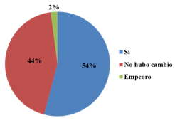 Posteriormente se aplicó una encuesta con el objetivo de determinar la situación en la que la población de estudio se encuentra actualmente, ya que alguna problemática individual puede influir en los resultados de la aplicación del producto. De la encuesta para determinar el tipo de población a la que puede dirigirse el producto, según se precia en la tabla 4, se obtuvo que el 52 % notó cambio significativo en la disminución de la caída de cabello, el 44 % no notó alguna diferencia y el 2 % manifestó que su problema empeoró (figura 2).