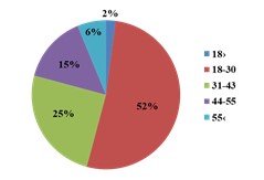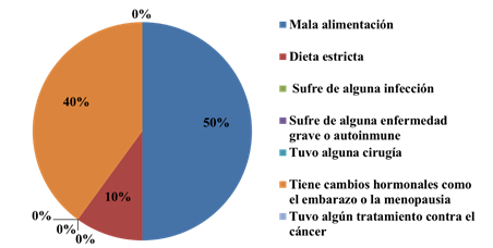 Con base al resultado de cambio significativo ante la caída de cabello, el resto de las respuestas del formulario de la tabla 4 se separó en tres categorías, destacando: rango de edad que evaluó el champú fue de 18 a 55 años; el 52 % está en el rango de 18 a 30 años, el 25 % de 31 a 43 años y el 15 % de 44 a 55 años (figura 3). El 65 % de la población de estudio es del sexo femenino, mientras que el 35 % es de sexo masculino. El 73 % de la población reconoce que tiene un problema actual de pérdida de cabello; el 67 % dice no tener antecedentes hereditarios de calvicie. El 75 % de personas considera que su estado de salud está en óptimas condiciones y el 25 % restante manifestó que la causa principal de no tener un estado de salud óptimo es por mala alimentación (50 %) mientras que el 40 % lo atribuye a cambios hormonales (figura 4). El 71 % de los encuestados dice usar, de forma constante, agentes químicos para la estética de su cabello. El 42 % de las personas encuestadas mencionó el uso de aparatos térmicos como planchas o secadoras para cabello o someterse a tratamientos que lo dañan. El 42 % de la población de estudio dice tener problemas de nerviosismo o estrés emocional y profesional.
