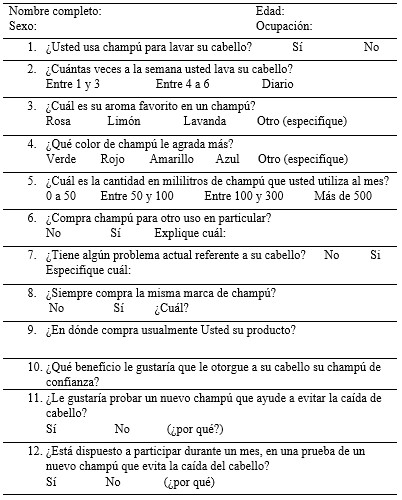 La recopilación de información para obtener datos sobre el producto por desarrollar y las preferencias del mercado, se realiza mediante procedimientos especializados que pueden aplicarse a través de cuestionarios por correo, entrevista telefónica, y entrevista personal.12 La tabla 2 muestra el cuestionario aplicado a 62 personas, con un rango de edad de 16 a 55 años, sin hacer distinción de sexo, ocupación o estado de salud, con el objetivo de conocer hábitos en el uso de champú, algunas características del champú que utilizan, y otras que desearían encontrar en un champú, así como su interés de probar uno nuevo.