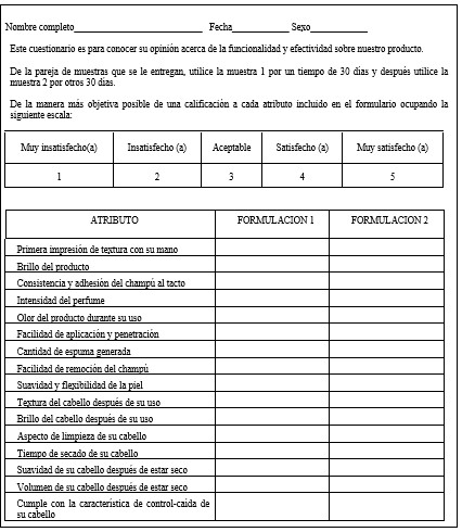 Los atributos evaluados para la funcionalidad del champú fueron: textura, brillo, consistencia, intensidad del aroma, permanencia del aroma, facilidad de aplicación, espuma generada y facilidad de enjuague. Mientras que los de efectividad fueron: suavidad y flexibilidad de la piel, textura, brillo, sensación de limpieza, tiempo de secado, suavidad y volumen del cabello, así como el efecto del control caída. La escala de evaluación fue de 1 a 5, donde 1 fue muy insatisfecho y 5 muy satisfecho.
