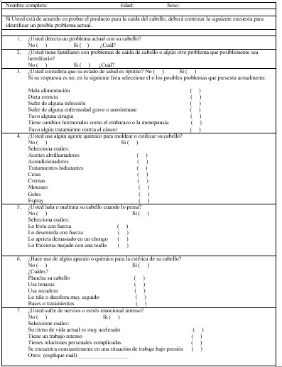 Se aplicó una tercera encuesta a la población que realizó el análisis sensorial a fin de conocer las causas que originan la pérdida de su cabello, y poder estimar el tipo de población al que puede dirigirse el producto, al haber observado un efecto positivo durante el uso de las muestras evaluadas. El cuestionario se presenta en la tabla 4.