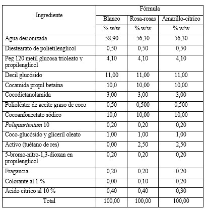 En el presente proyecto se utilizaron tuétano de res, agua destilada, diestearato de polietilenglicol, Peg-120 metilglucosa trioleato y propilenglicol, decilpoliglucósido, cocamida propilbetaína, cocodietanolamida, polioléster de aceite graso de coco, cocoanfoacetato sódico, Polyquaternium 10, coco-glucósido y gliceril oleato, 5-bromo-nitro-1,3-dioxan en propilenglicol, fragancia (esencia orange, esencia de rosas), colorante al 1 % (amarillo huevo y rosa fucsia), ácido cítrico al 10 %. Los reactivos fueron de grado analítico.