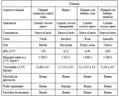 A las formulaciones finales al blanco y a un champú comercial anticaída se les realizaron las pruebas de análisis fisicoquímicos, así como pruebas de aplicación. Los resultados se muestran en tabla 6.