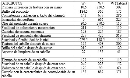 El análisis de los datos de la evaluación sensorial realizado con el método de prueba de rango con signos en datos pareados, arrojó preferencia de la muestra de champú con tuétano sobre el blanco, al ser los valores de W- menores a los W+. En la tabla 8, para los atributos consistencia y adhesión al tacto, intensidad del perfume, olor del producto durante su uso, cantidad de espuma generada, facilidad de remoción, aspecto de limpieza del cabello y cumplimiento de la característica de control caída del cabello, se presentan los siguientes resultados (tabla 8).
