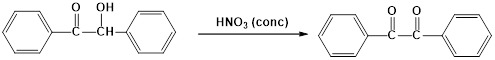 0,071 mol of benzoin and 1,034 mol of concentrated nitric acid (HNO3) were added in a balloon coupled to a reflux condenser. The mixture was heated to reflux in a water bath, until the evolution of the nitrogen oxides ceased (approx. 45 min). It was allowed to cool and the reaction mixture was poured into a beaker with cold water, stirred until the oil completely became a yellow solid (benzyl). The product was filtered and the purification was carried out by recrystallization of ethanol. The benzyl obtained after recrystallization was a bright yellow crystalline solid with the form of needles. The melting temperature was 93,8- 94,9 °C, which is in correspondence with the literature (94,78 ° C).19 Yield: 79 %.