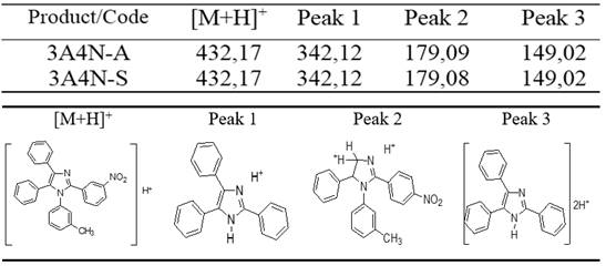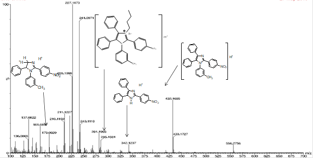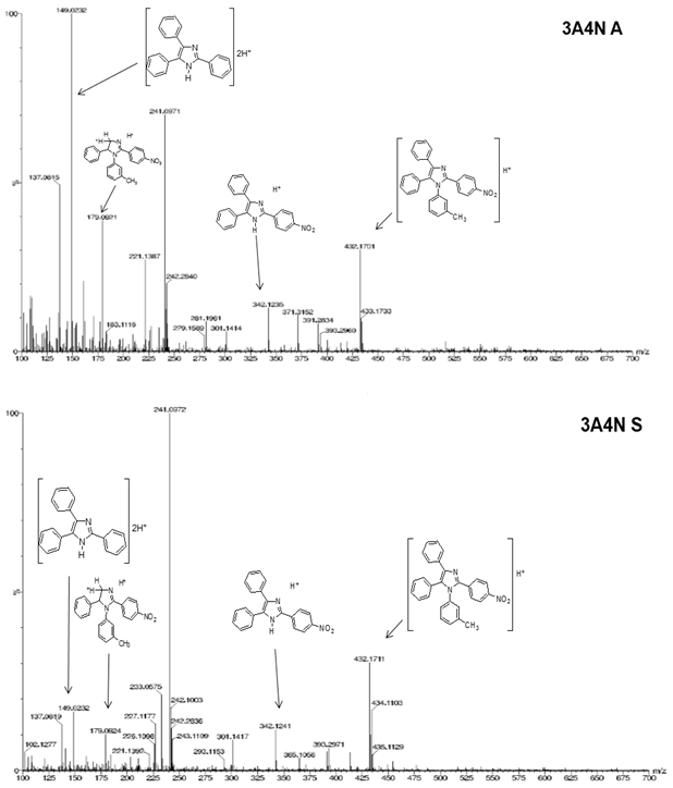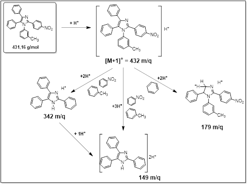 To have a clearer idea of the structure of the imidazoles obtained, as illustrated in the title of this article, an Electro Spray Ionization Mass Spectrometry (ESI-MS) analysis was performed. This allowed corroborating the obtaining of this imidazole in the fractions described above (3A4N-A and 3A4N-S) and that whose spectra coincide almost completely. table 3 shows the main peaks found and predicted in the fragmentation scheme (figure 5).20 First of all, it was possible to identify the M+H peak, which shows coincidence with the molar mass of 1-(3-methylphenyl)-2-(4-nitrophenyl)-4,5-diphenylimidazol (table 3). Some peaks corresponding to defined fractionations for this imidazole were then identified, as shown in figure 5 and figure 6.
