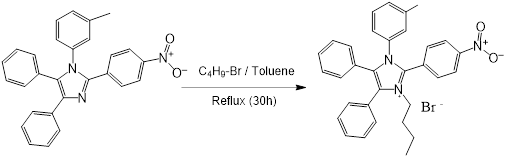 0,0023 mol of 1-(3-methylphenyl)-2-(4-nitrophenyl)-4,5-diphenylimidazol and 0,004 mol of C4H9Br with 0,23 mL of toluene were added on a round bottom balloon. Heated under reflux for 30 h, 2 layers formed. The bottle was cooled to room temperature and then allowed to cool overnight. A solid formed and the excess of toluene was decanted. The product was recrystallized with a minimum amount of acetonitrile, with the addition of 1mL of diethyl ether. It was then filtered under vacuum and the resulting solid dried for 48 h in a desiccator. Yield: 53 %. The quaternary imidazole salt was characterized by ESI-MS.