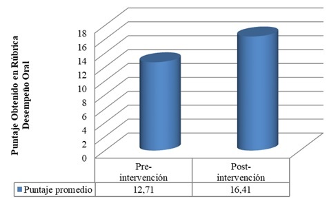Con respecto al puntaje total obtenido, la rúbrica obtuvo 18 puntos. En la Figura 7 puede observarse la media del Test de desempeño oral inicial correspondiente a M= 12.71 y la media del Test de desempeño oral final correspondiente a M= 16.41.