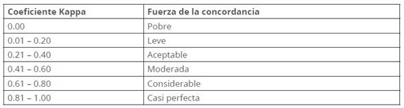 Este instrumento fue aplicado pre y post-intervención y luego valorado por dos evaluadores (1 y 2). Primero, para verificar la proporción de la concordancia observada por ambos evaluadores se calculó el coeficiente de Kappa. Según Cerda y Villarroel (2008) “el coeficiente kappa puede tomar valores entre -1 y +1. Mientras más cercano a +1, mayor es el grado de concordancia inter-observador. Por el contrario, mientras más cercano a -1, mayor es el grado de discordancia inter-observador” (p. 56). Ambos autores citan a Landis y Koch (1977), a quienes se suma Abraira (2000) para ejemplificar los valores del coeficiente Kappa en una tabla como la que se muestra a continuación y que servirá de guía para este proyecto de investigación (Ver Tabla 1).