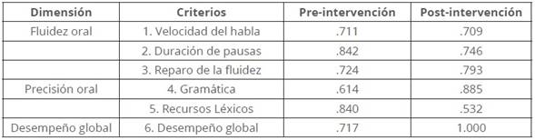 En relación con los resultados obtenidos por ambos evaluadores (1 y 2), en el Test de desempeño oral aplicado en la pre y en la post-intervención se puede apreciar que en la pre-intervención el coeficiente de Kappa, con intervalo de confianza de 95 %, en la Dimensión Fluidez oral fluctúa entre .711 y .842 lo cual según Cerda y Villarroel (2008) es una fuerza de concordancia entre Considerable y Casi perfecta. Igualmente, en la dimensión Precisión oral, el coeficiente fluctúa entre .614 y .840, cuya fuerza de concordancia es Considerable y Casi perfecta. En relación con la post-intervención, en la dimensión Fluidez oral el coeficiente varía entre .709 y .793 por lo que la fuerza de concordancia es Considerable. En la dimensión Precisión oral varía entre .532 y .885 por lo que la fuerza de concordancia varía entre Moderada y Casi perfecta. En conclusión, la confiabilidad inter-evaluadores en general es Considerable como puede observarse en la Tabla 2.