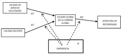 En la Figura 1 se presenta la red conceptual relativa a las hipótesis planteadas en el modelo. Se observa que tanto la percepción de la calidad docente como la percepción de la calidad del servicio facilitador pueden ser antecedentes de la percepción de la calidad global de la carrera, y que esta última puede ser antecedente de la intención de recomendar la universidad. Por tanto la variable calidad global de la carrera es una variable mediadora entre calidad docente y calidad del servicio facilitador respecto a la variable intención de recomendar la universidad. La moderación de la variable experiencia se concreta en su potencial efecto en todas las relaciones anteriormente postuladas.