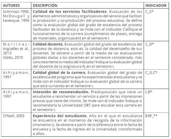 Estudios realizados han señalado que la percepción de la calidad tiene un efecto positivo en la intención de recomendación (Teo y Soutar, 2012; Athiyaman, 1997; Paswan y Ganesha, 2009) y muchas de las investigaciones en calidad han tendido a centrarse en las dimensiones de la docencia (Ramsden, 1991; Marsh y Roche, 1993), o de los servicios facilitadores (Palmer y Holt, 2009; Marzo et al., 2005; O'Neill y Palmer, 2004), pero pocas en el abordaje multidimensional o global de la percepción de la calidad (Rubinsztejn et al., 2015; Clewes, 2003; Hill, 1995; Wang, 2012; Petruzellis et al., 2006). De los trabajos que consideran ambas dimensiones cabe destacar el de Hill (1995), quien señala que la importancia que asignan los estudiantes a la dimensión servicios facilitadores es más dinámica que la relativa a la propia docencia. En otros términos, que el peso de los determinantes de la calidad total de la educación superior varía con la experiencia que adquieren los estudiantes al avanzar en la carrera.