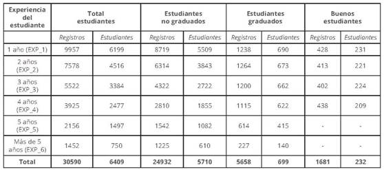 A partir de la aplicación de los controles señalados y la correspondiente depuración de estudiantes y registros se construye una nueva variable dinámica que recoge la experiencia del estudiante en su paso por la universidad. Dado que se disponía de la fecha de realización de la encuesta (para cada uno de los registros) y de la fecha de entrada del estudiante en la universidad (fecha única), la simple sustracción entre ambas variables nos proporciona una variable proxy de la experiencia que va teniendo el estudiante en cada semestre con la universidad en la que está cursando sus estudios. En la Tabla 2 se describe la variable experiencia del estudiante con la universidad. Por lo tanto, la variable experiencia del estudiante (EXP_) se construye restando de la fecha de encuesta la fecha de ingreso del mismo en la universidad y posteriormente se transforma en años de experiencia. De esta forma se obtiene una variable con 4 categorías de respuesta, de 1 a 4, que consignamos como EXP_1, EXP_2, EXP_3 y EXP_4.