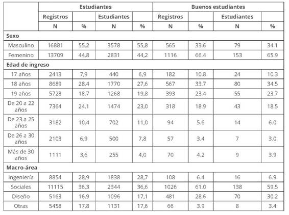 En la Tabla 3 se presentan los perfiles descriptivos de la muestra total respecto de la muestra de los buenos estudiantes en la Universidad ORT. Esto es, se da cuenta del perfil de este tipo de estudiantes respecto al perfil general. Destaca la asociación positiva entre el porcentaje de mujeres y de buenos estudiantes (42.2% frente a 65.9%; (2(1)=9.8 p<.00). Respecto a macro área existen diferencias entre ambos perfiles ((2(3)=33.2 p<.00); relación positiva con Sociales (36.6% frente a 59.5%) y Diseño (17.1% frente a 30.2%) y relación negativa con Ingeniería (28.7% frente a 6.9%) y otros programas (17.6% frente a 3.4%).