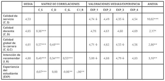 A efectos de analizar con mayor detalle estas relaciones negativas (experiencia del buen estudiante respecto a las variables de interés) se realiza un análisis de la varianza (ANOVA), calculando y testeando la igualdad de medias de C_S, C_D, C_G.C e I_R en las categorías de la variable experiencia (EXP_1, EXP_2, EXP_3 y EXP_4). Los resultados de este análisis ponen de manifiesto que sí existe cierta tendencia negativa pero que no es lineal ni igual en todas las variables objetivo. Los niveles de calidad y de intención de recomendación de la universidad descienden levemente conforme aumenta la experiencia del estudiante con la Universidad.